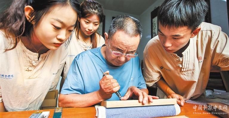 雕版印刷技藝國(guó)家級(jí)非遺項(xiàng)目代表性傳承人陳義時(shí)(中)在給山東水利職業(yè)學(xué)院大學(xué)生非遺藝術(shù)實(shí)踐社團(tuán)學(xué)員傳授技藝。李建偉攝(中經(jīng)視覺)
