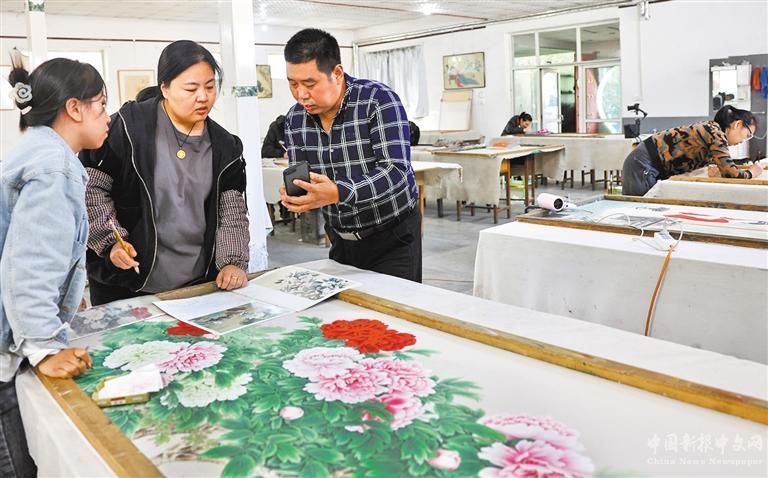 河北省寧晉縣河渠鎮(zhèn)褚家莊村,工筆畫非遺傳承人趙艷飛(左三)指導(dǎo)學(xué)員工筆畫的作畫技巧。張懿莉攝(中經(jīng)視覺)