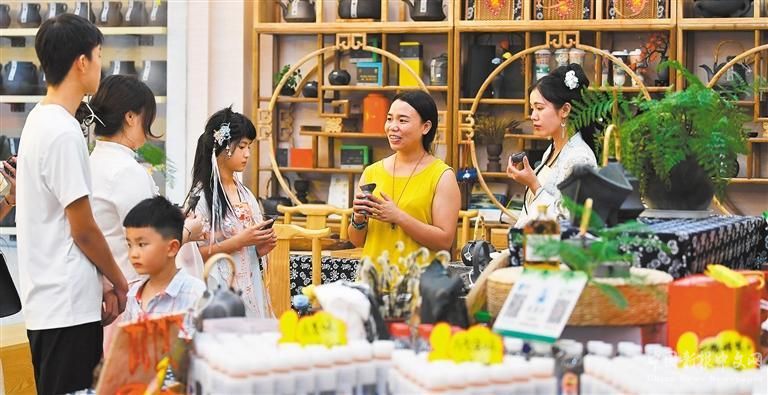 湖南省郴州長(zhǎng)卷文化旅游區(qū)魯塘砂罐陶藝館,何娟娟(右二)在為游客講解非遺“砂罐燒制技藝”。經(jīng)濟(jì)日?qǐng)?bào)記者 高興貴攝
