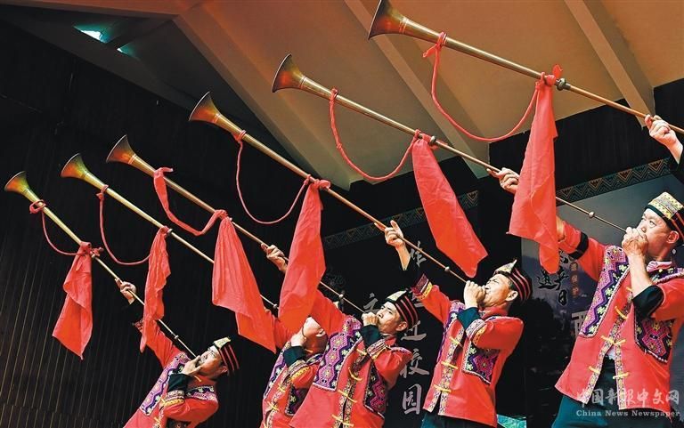 重慶市酉陽(yáng)土家族苗族自治縣龔灘鎮(zhèn)中心小學(xué),非遺傳承人表演非遺項(xiàng)目《土家長(zhǎng)號(hào)》。邱洪斌攝(中經(jīng)視覺)