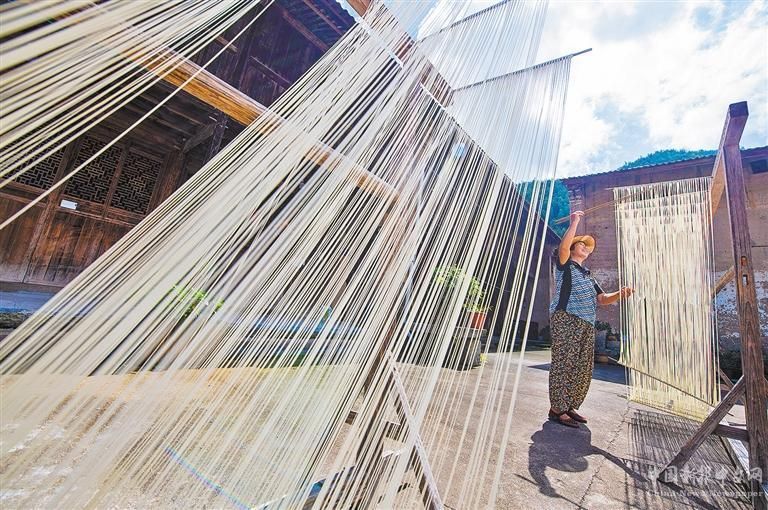 浙江省浦江縣杭坪鎮(zhèn),農(nóng)戶在晾曬手工面。這里的手工面稱為“浦江一根面”,可以拉上好幾百米不斷,其制作技藝被列入省級(jí)非遺項(xiàng)目。時(shí)寬兵攝(中經(jīng)視覺)