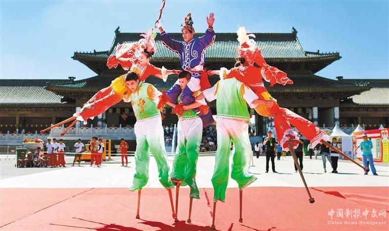 內(nèi)蒙古伊金霍洛旗舉行第一屆九州非遺絕技文化旅游節(jié)暨非遺旅游嘉年華,民間藝人表演海城高蹺。王 正攝(中經(jīng)視覺)