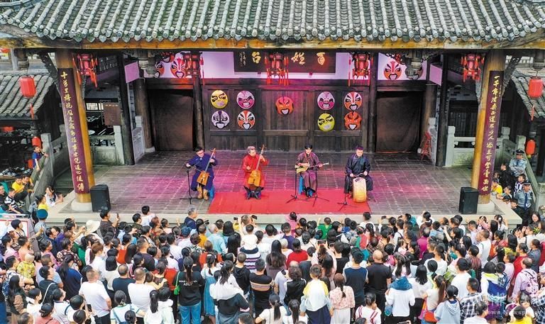 四川省合江縣堯壩古鎮(zhèn),非遺項(xiàng)目蒙古呼麥馬頭琴表演,吸引游客駐足觀看。李貴平攝(中經(jīng)視覺)