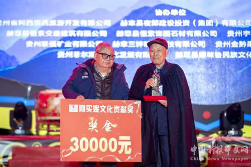 原貴州省政協(xié)副主席黃家培向阿買妮文化貢獻(xiàn)獲得者阿庫烏霧院長(zhǎng)宣讀授獎(jiǎng)詞并頒獎(jiǎng):感佩于他對(duì)國(guó)家教育和民族文化發(fā)展所作出的努力與成績(jī),感佩于他為豐富和完善中國(guó)詩學(xué)理論內(nèi)涵貢獻(xiàn)了彝族獨(dú)特的詩性智慧。