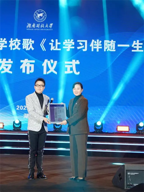 為感謝袁樹雄為創(chuàng)作校歌的傾情付出,儀式上,湖南開放大學(xué)黨委書記曾寶成為袁樹雄頒發(fā)了校歌創(chuàng)作榮譽(yù)證書,誠盼其為推動(dòng)母校事業(yè)發(fā)展作出更大成就與貢獻(xiàn)。袁樹雄也向母校贈(zèng)予了《讓學(xué)習(xí)伴隨一生》歌曲版權(quán)。