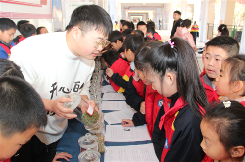 在中醫(yī)藥知識講座區(qū),來自縣中醫(yī)醫(yī)院中藥師們給同學(xué)們講解了中醫(yī)藥的基本知識和本地中藥材知識,讓大家了解了中醫(yī)藥的發(fā)展歷程,知道了針灸、火罐等傳統(tǒng)中醫(yī)特色療法。在中醫(yī)藥文化手工實踐體驗區(qū),同學(xué)們在藥師們的耐心指導(dǎo)下動手操作,親自實踐,手工體驗制作中藥香包、調(diào)配中藥、包中藥,近距離感受我國傳統(tǒng)中藥是如何加工炮制、調(diào)配制作。在中醫(yī)文化展區(qū),中醫(yī)經(jīng)絡(luò)圖、內(nèi)經(jīng)圖、修真圖、八段錦……,圖文并茂的一塊塊宣傳板展示著中國歷代名醫(yī)、中醫(yī)古代書籍、古代中醫(yī)文物故事、中醫(yī)基礎(chǔ)知識等。在中藥品種展區(qū),一排排長桌上放滿了60余種中藥藥材實物,讓學(xué)生能夠親自感受到中藥的形、色、品、味,感受古人對于中藥的四氣五味分類方法以及治病的智慧。