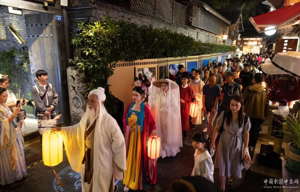 9月29日,在成都寬窄巷子新“十二月市”街區(qū),裝扮成唐宋時(shí)代人物形象的演員在巡游表演。新華社記者 江宏景 攝