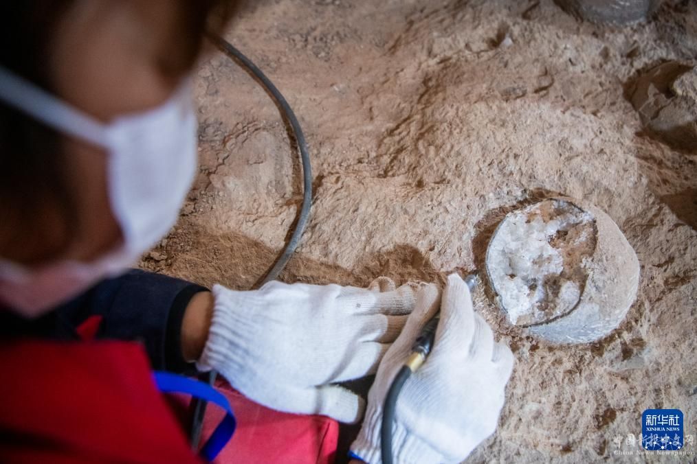 12月22日,工作人員進(jìn)行恐龍蛋化石原位修復(fù)工作。