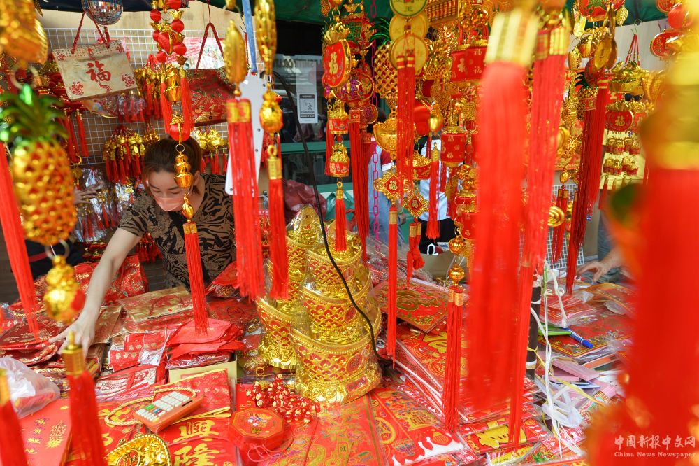一名商販在泰國(guó)曼谷唐人街的攤位上擺放春節(jié)飾品。新華社發(fā)(拉亨攝)