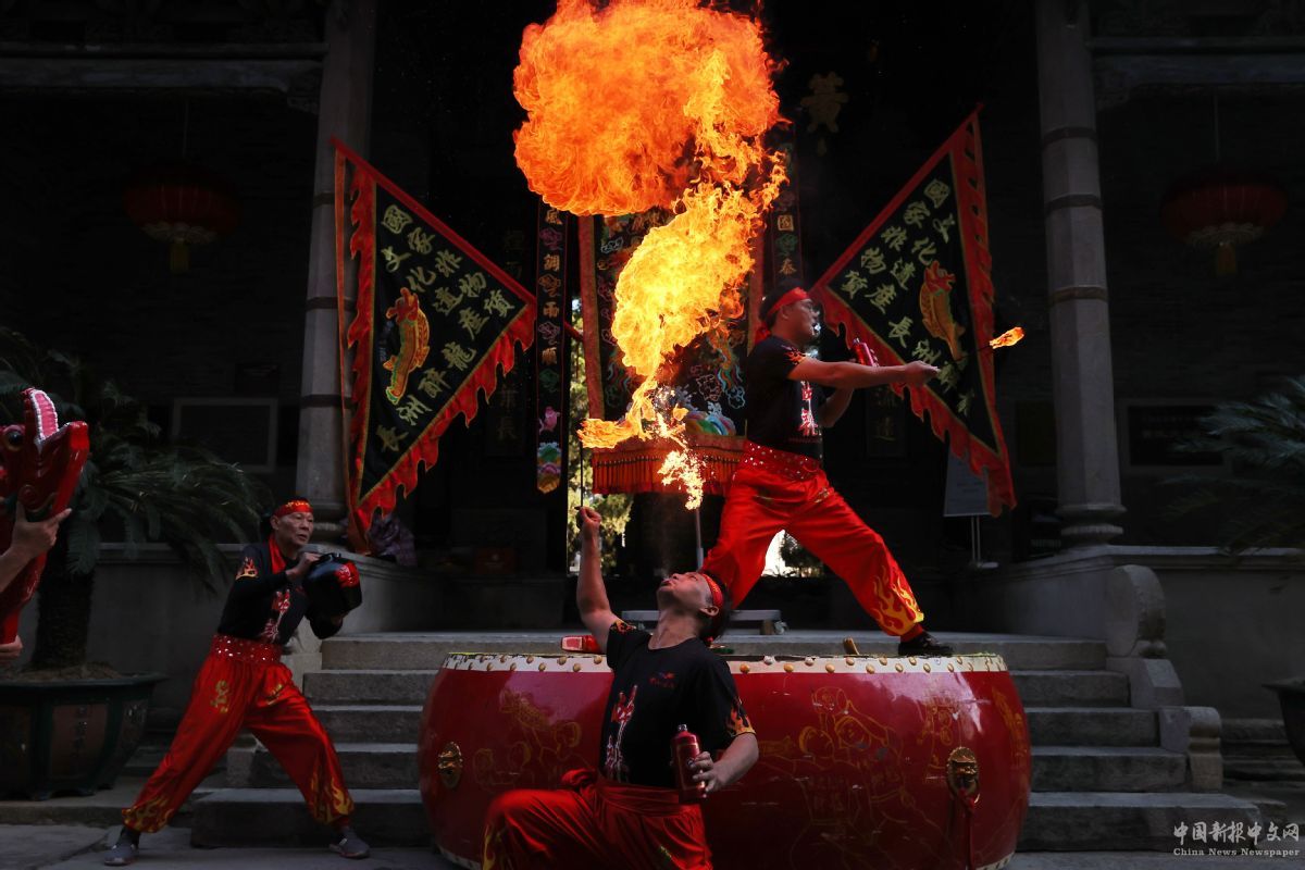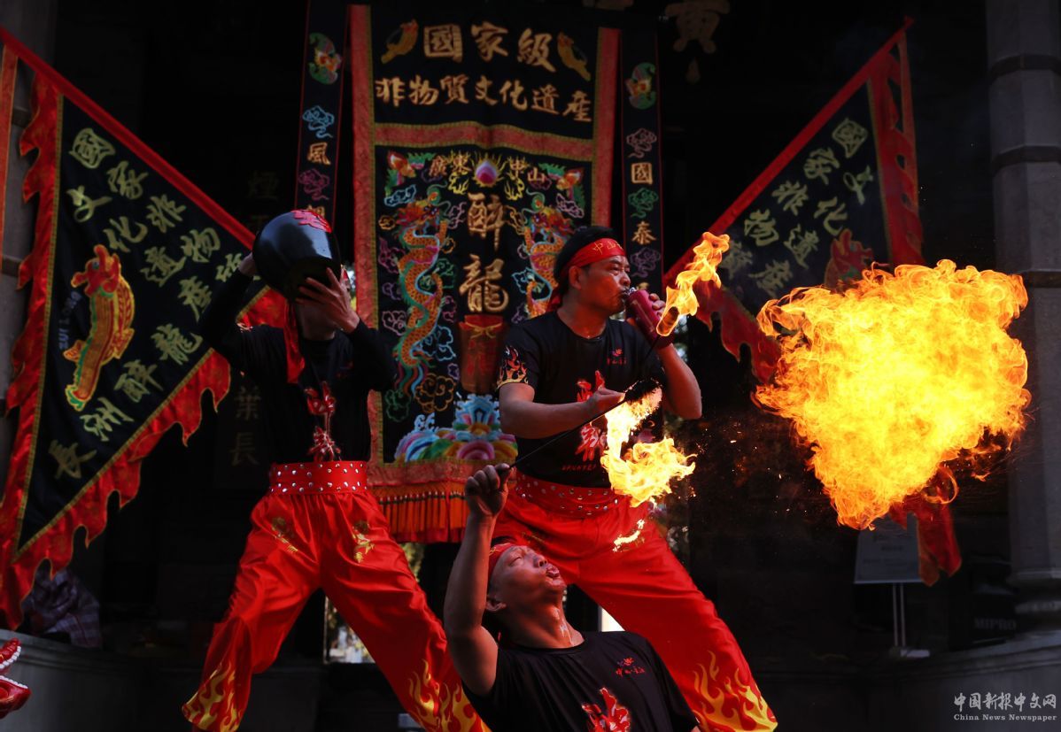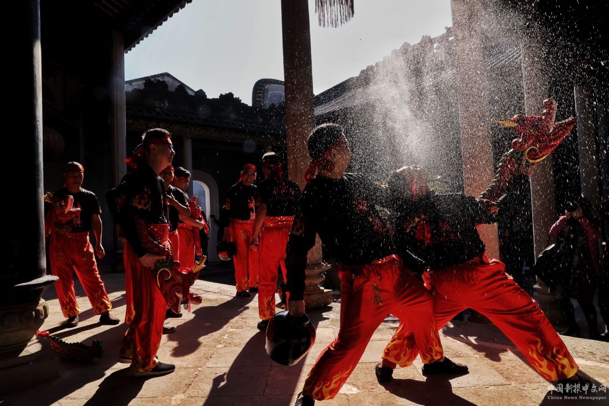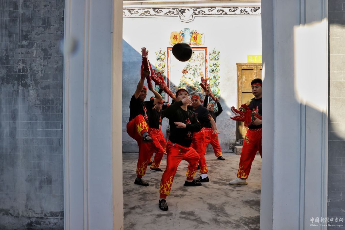 12月24日,中山醉龍舞在長洲村的黃氏大宗祠前上演。中國日報(bào)記者 姜東 攝