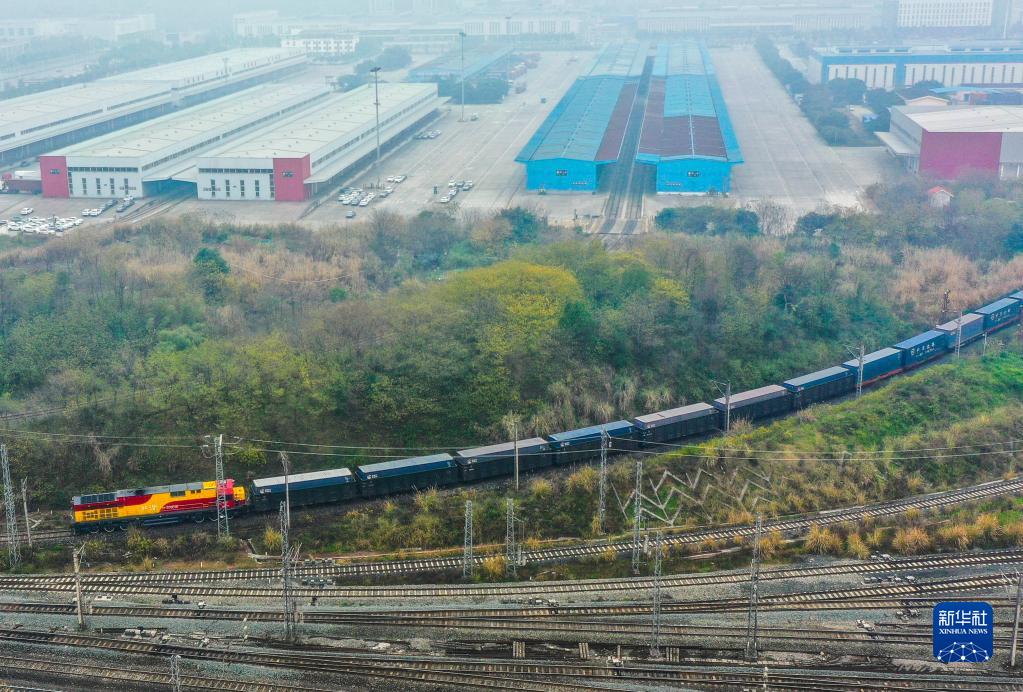 1月22日,農(nóng)歷新年首趟西部陸海新通道鐵海聯(lián)運(yùn)班列從重慶團(tuán)結(jié)村中心站發(fā)車(無人機(jī)照片)。新華社記者 劉潺 攝