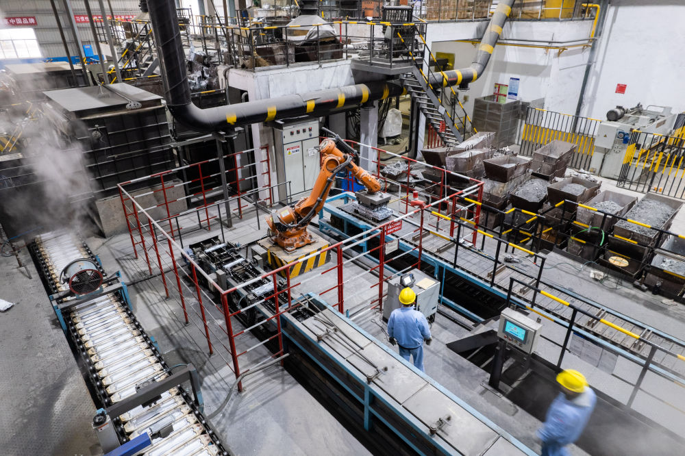 2月14日,在位于株洲市淥口經(jīng)開區(qū)南洲工業(yè)園的湖南株冶火炬新材料有限公司,工作人員在生產(chǎn)鋅基合金產(chǎn)品(無人機照片)。新華社記者陳思汗 攝