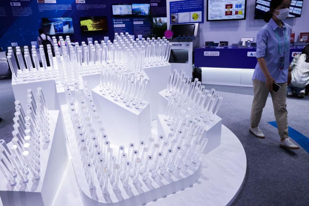 這是5月26日在中關(guān)村國家自主創(chuàng)新示范區(qū)展示中心拍攝的100量子比特相干光量子計(jì)算機(jī)(模型)。新華社記者 任超 攝