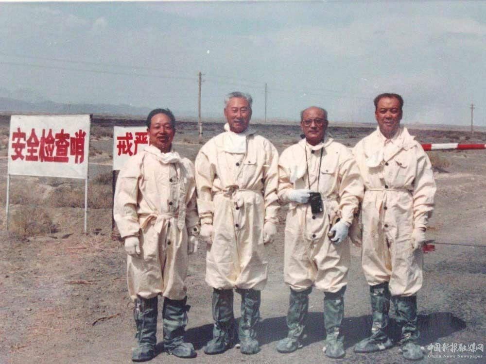 ↑一次核爆炸試驗(yàn)后,林俊德(左一)和參試人員從試驗(yàn)場區(qū)完成取樣任務(wù)后合影留念(資料照片)。新華社發(fā)