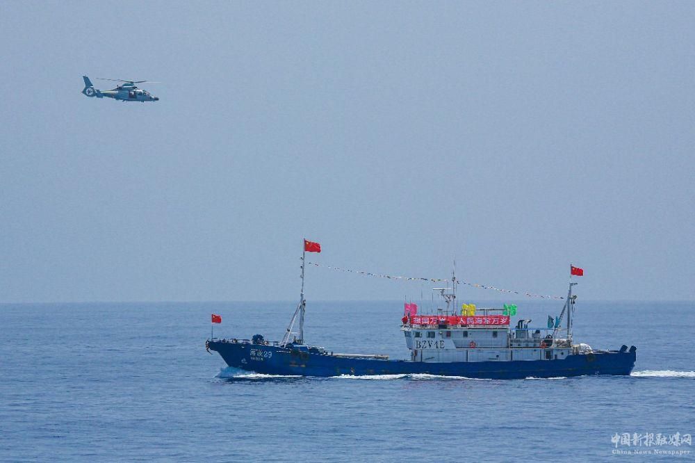↑中國海軍第40批護(hù)航編隊(duì)中的艦載直升機(jī)在被護(hù)船只周邊海域巡邏警戒(2022年6月4日攝)。新華社發(fā)(唐文 攝)