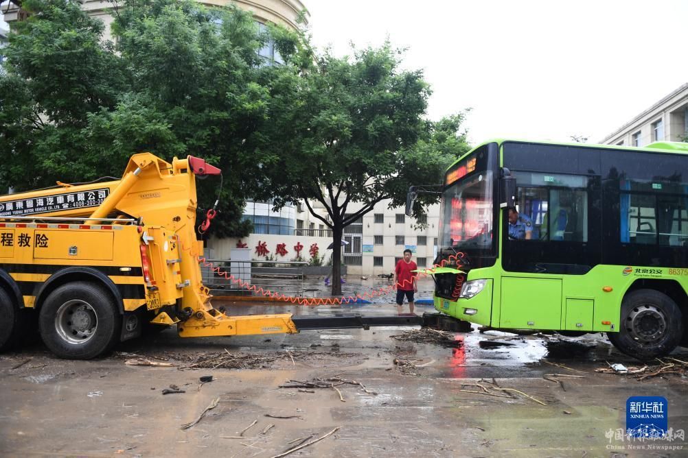 7月31日,搶險(xiǎn)人員在北京市門頭溝區(qū)新橋大街救援拋錨的公交車。新華社記者 鞠煥宗 攝