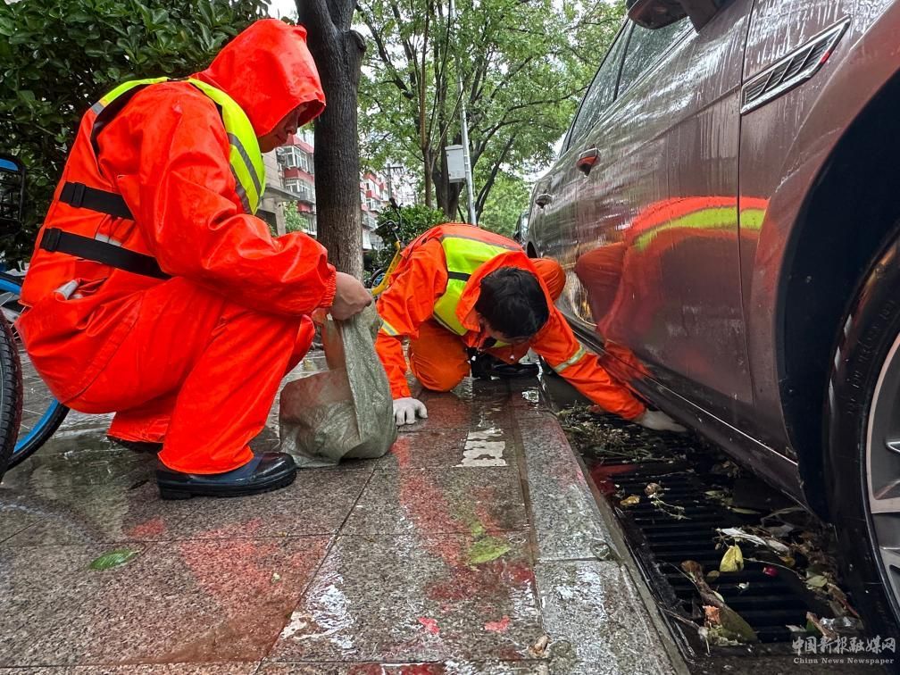 圖為7月31日,邵松松與同事清掏雨水篦子。新華社記者 田晨旭 攝