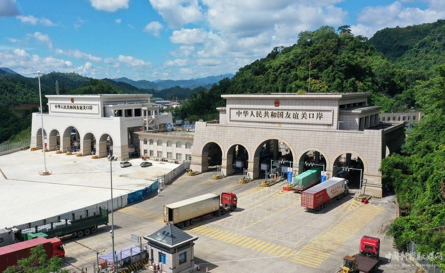 這是在廣西憑祥友誼關(guān)口岸通關(guān)的運輸車輛(無人機照片)。新華社記者 楊馳 攝