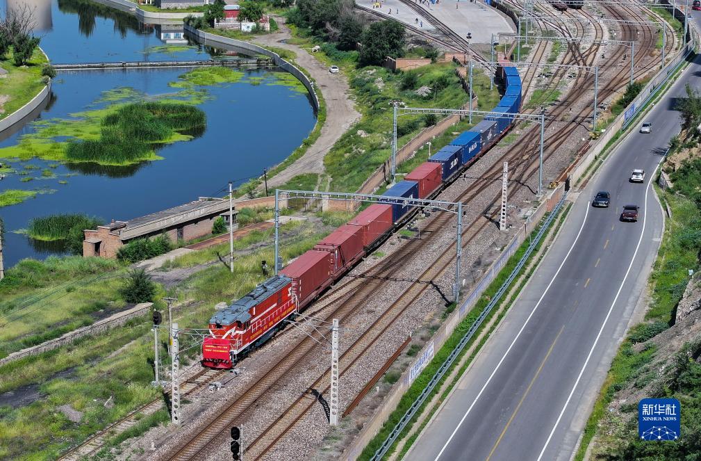 8月29日,首趟中歐(中亞)班列“京張?zhí)?rdquo;從張家口市下花園鐵路貨運(yùn)中心場(chǎng)區(qū)啟程(無(wú)人機(jī)照片)。
