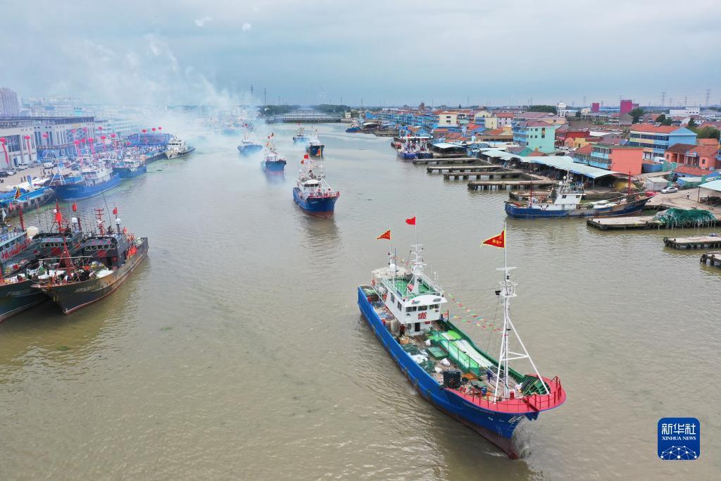 9月16日,在江蘇省鹽城市射陽縣黃沙港國家中心漁港,漁船開漁出海(無人機照片)。