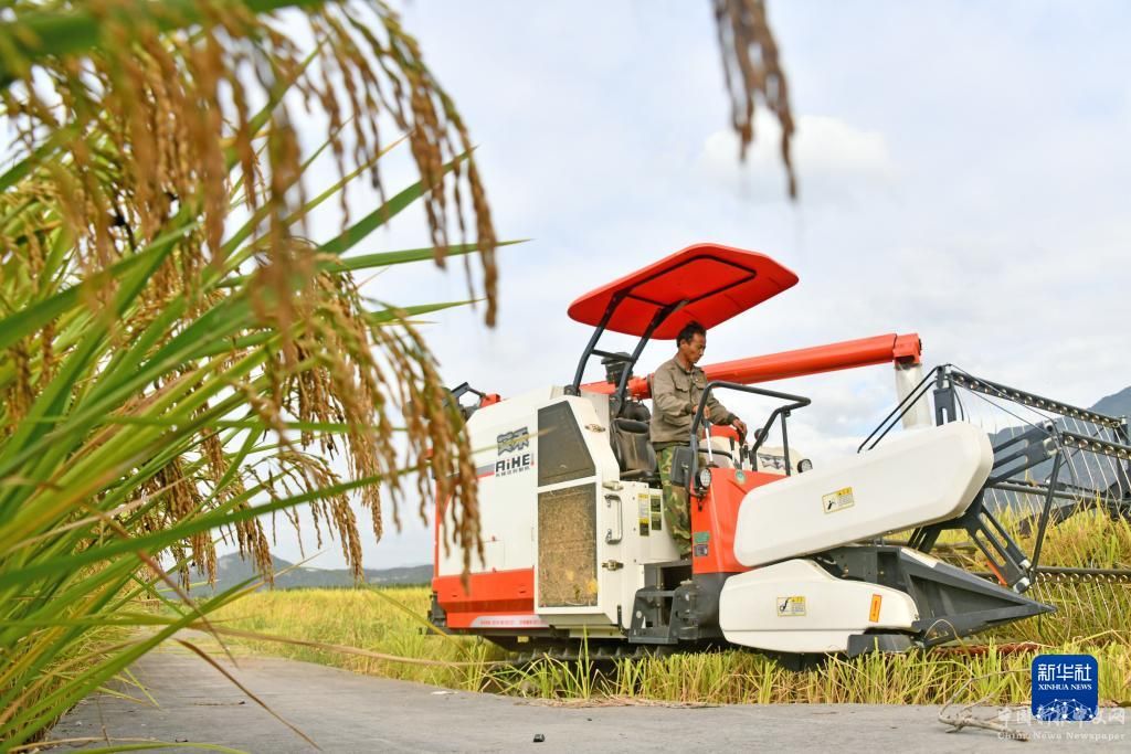 10月5日,浙江省臺(tái)州市仙居縣白塔鎮(zhèn)農(nóng)民在收割水稻。