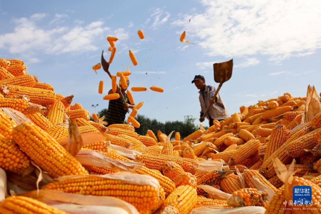 10月5日,在河北省石家莊晉州市周家莊鄉(xiāng)第七生產(chǎn)隊(duì),農(nóng)民在晾曬收獲的玉米。