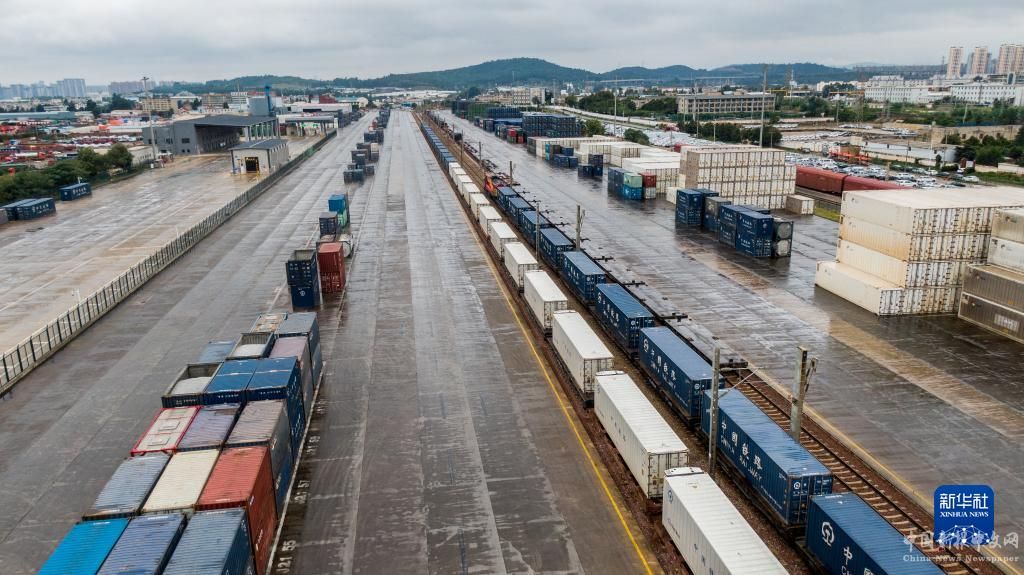 10月8日,“滬滇·瀾湄線”國際貨運班列駛出昆明市王家營西站(無人機照片)。