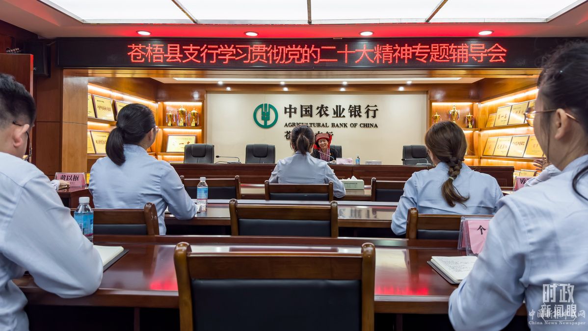 △2022年11月,廣西梧州,中國(guó)農(nóng)業(yè)銀行蒼梧縣支行黨委邀請(qǐng)黨的二十大代表祝雪蘭同志為蒼梧縣支行黨員開(kāi)展學(xué)習(xí)貫徹黨的二十大精神專題輔導(dǎo)。(圖/視覺(jué)中國(guó))