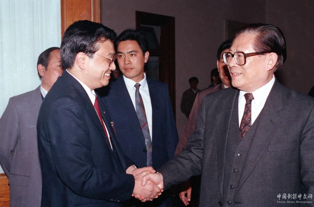 1993年5月3日下午,中國共產(chǎn)主義青年團(tuán)第十三次全國代表大會(huì)在北京人民大會(huì)堂開幕。在5月3日上午的預(yù)備會(huì)議后,舉行第一次主席團(tuán)會(huì)議,推選李克強(qiáng)等同志為主席團(tuán)常務(wù)主席。這是江澤民同志與李克強(qiáng)同志握手。