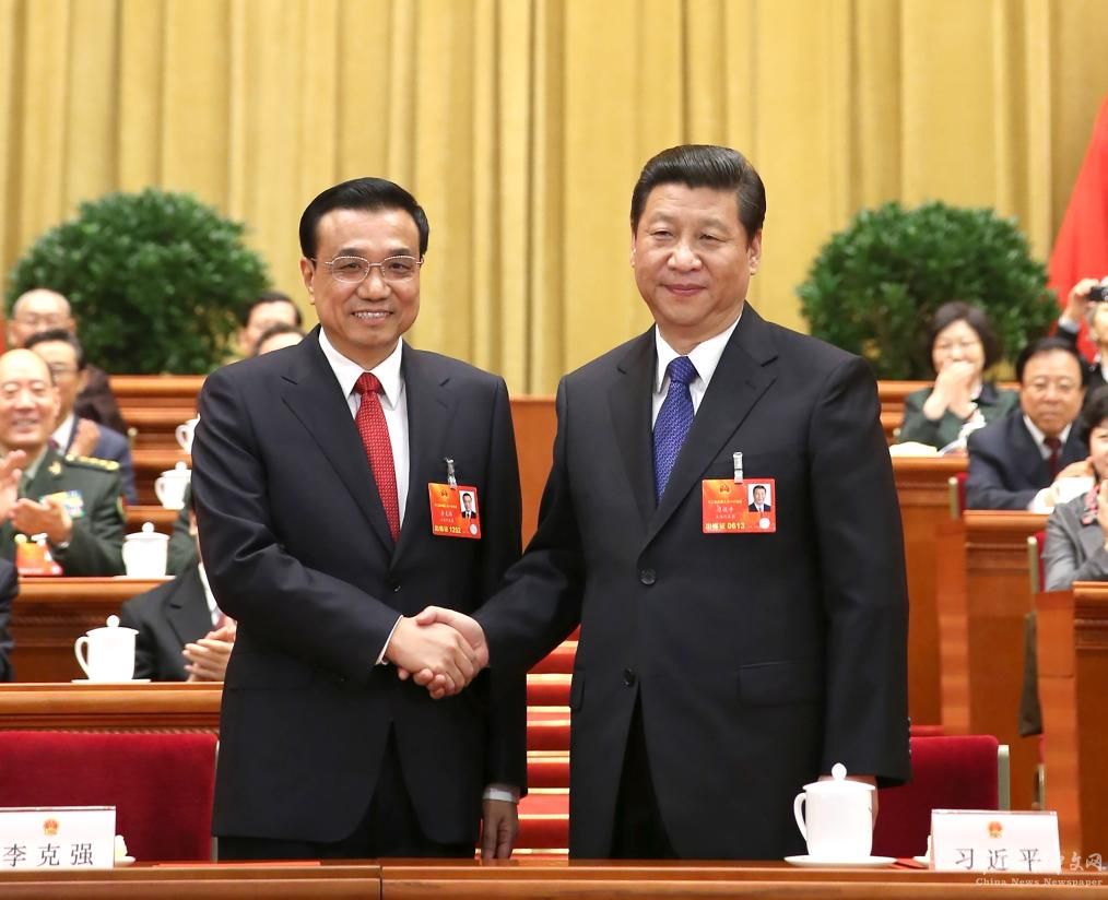 2013年3月15日,第十二屆全國人民代表大會(huì)第一次會(huì)議在北京人民大會(huì)堂舉行第五次全體會(huì)議。會(huì)議經(jīng)過投票表決,決定李克強(qiáng)為中華人民共和國國務(wù)院總理。這是習(xí)近平同志和李克強(qiáng)同志親切握手。