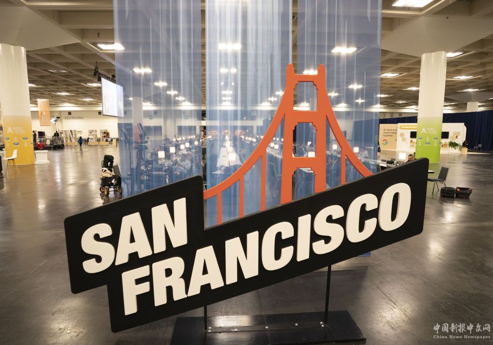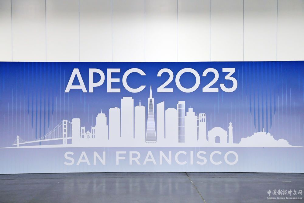 這是在美國舊金山拍攝的2023年亞太經(jīng)合組織會議國際媒體中心的海報。