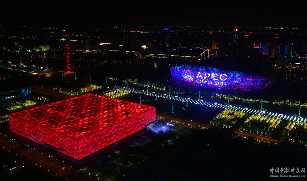 2014年11月6日晚拍攝的北京國家體育場“鳥巢”、北京國家游泳中心“水立方”及周邊區(qū)域夜景。