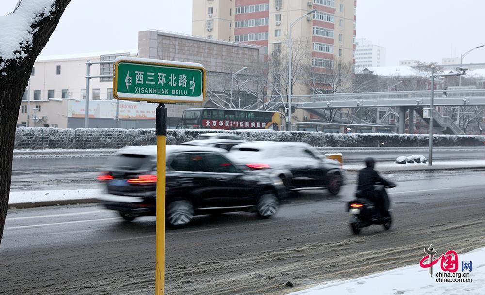 12月10日夜間開始,北京各地天空陸續(xù)飄雪,北京今冬首場(chǎng)降雪緩緩落下。預(yù)計(jì)11日白天,北京仍有小雪或零星小雪天氣,最高氣溫1℃左右,體感寒冷。圖為12月11日,北京西三環(huán)北路車輛在道路上行駛。中國(guó)網(wǎng)記者 劉楨珂攝影