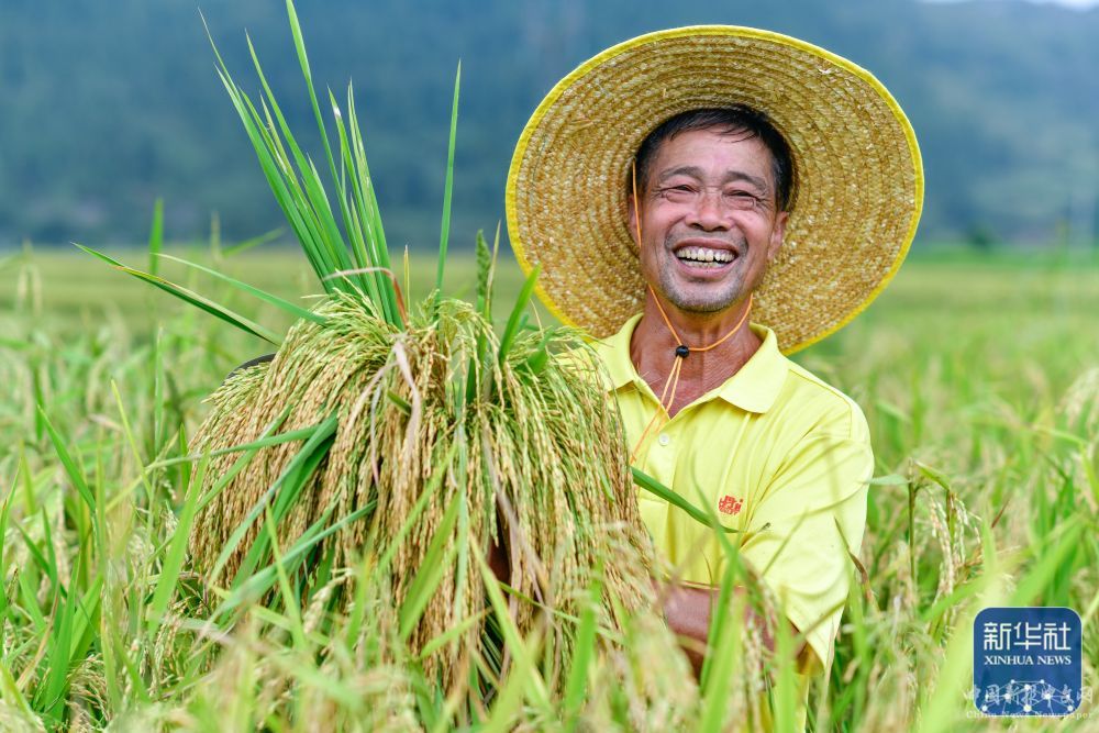 2023年8月26日,貴州省黔東南苗族侗族自治州岑鞏縣水尾鎮(zhèn)新場(chǎng)村的雜交水稻制種大戶陳良東展示收獲的水稻種子。
