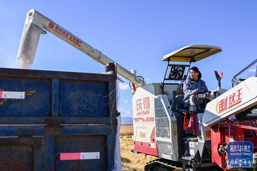 2023年10月20日,“80”后劉春艷在琿春市三家子滿族鄉(xiāng)東崗子村的水稻田里駕駛收割機(jī)收割水稻。