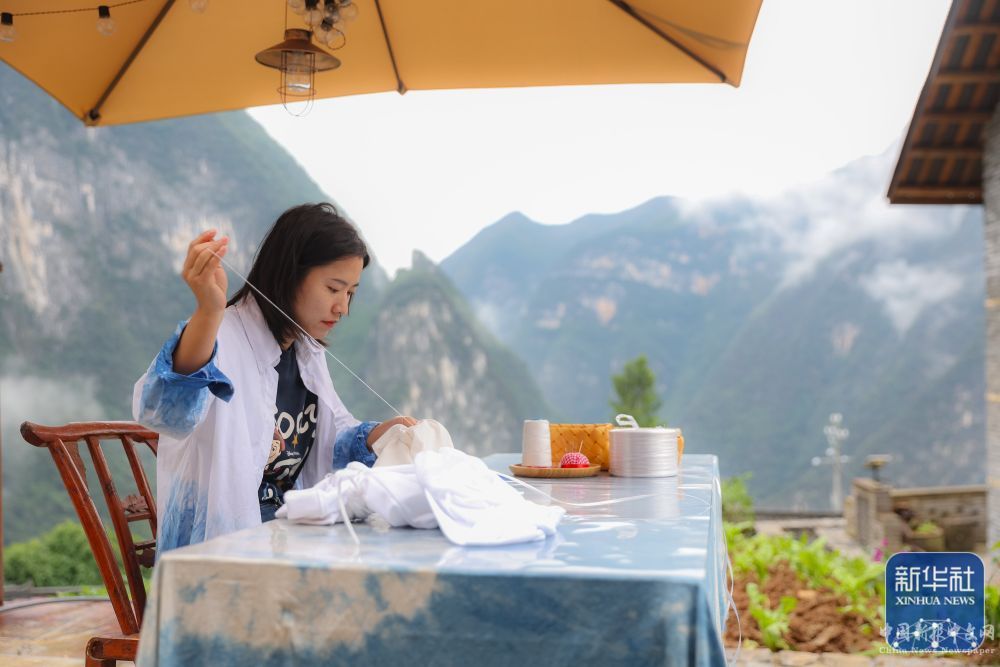 2023年10月10日,在重慶市巫山縣竹賢鄉(xiāng)下莊村,31歲的袁孝鑫在創(chuàng)作扎染圖案。