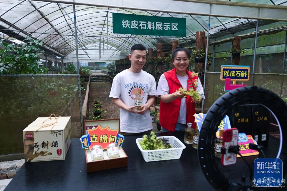 2023年6月8日,在諸暨市東白湖鎮(zhèn)的鐵皮石斛有機(jī)種植基地,基地負(fù)責(zé)人孫思寶(左)和志愿者一起直播賣鐵皮石斛花茶、鐵皮石斛酒等產(chǎn)品。