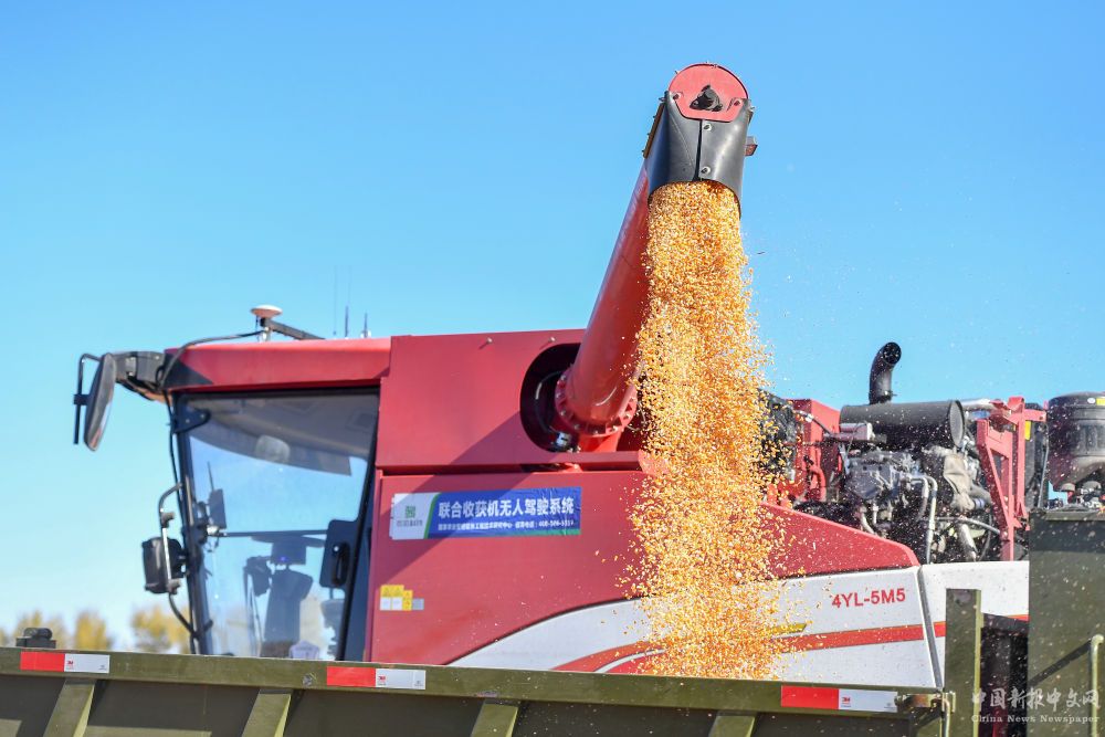 在中國(guó)科學(xué)院“黑土糧倉(cāng)”科技會(huì)戰(zhàn)長(zhǎng)春示范區(qū)公主嶺示范基地,無人駕駛農(nóng)機(jī)將收獲的玉米裝車(2023年10月19日攝)。