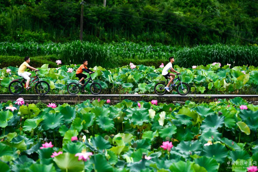 孩子們?cè)谫F州省岑鞏縣客樓鎮(zhèn)下寨村騎行游玩(8月2日攝)。