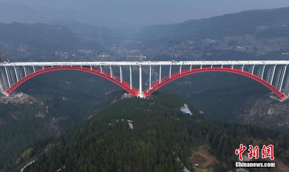 12月27日,伴隨著最后一塊橋面板成功嵌入,渝湘復線高速公路雙堡特大橋?qū)崿F(xiàn)全橋合龍。據(jù)承建方中交第二公路工程局有限公司介紹,該橋為世界在建最大跨徑雙跨連續(xù)拱橋。圖為航拍渝湘復線高速公路雙堡特大橋。中新網(wǎng)記者 陳超 攝