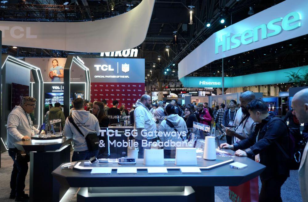 2024年1月11日,人們?cè)诿绹咕S加斯消費(fèi)電子展上參觀TCL公司(左)和海信公司(右)展臺(tái)。新華社記者 吳曉凌 攝
