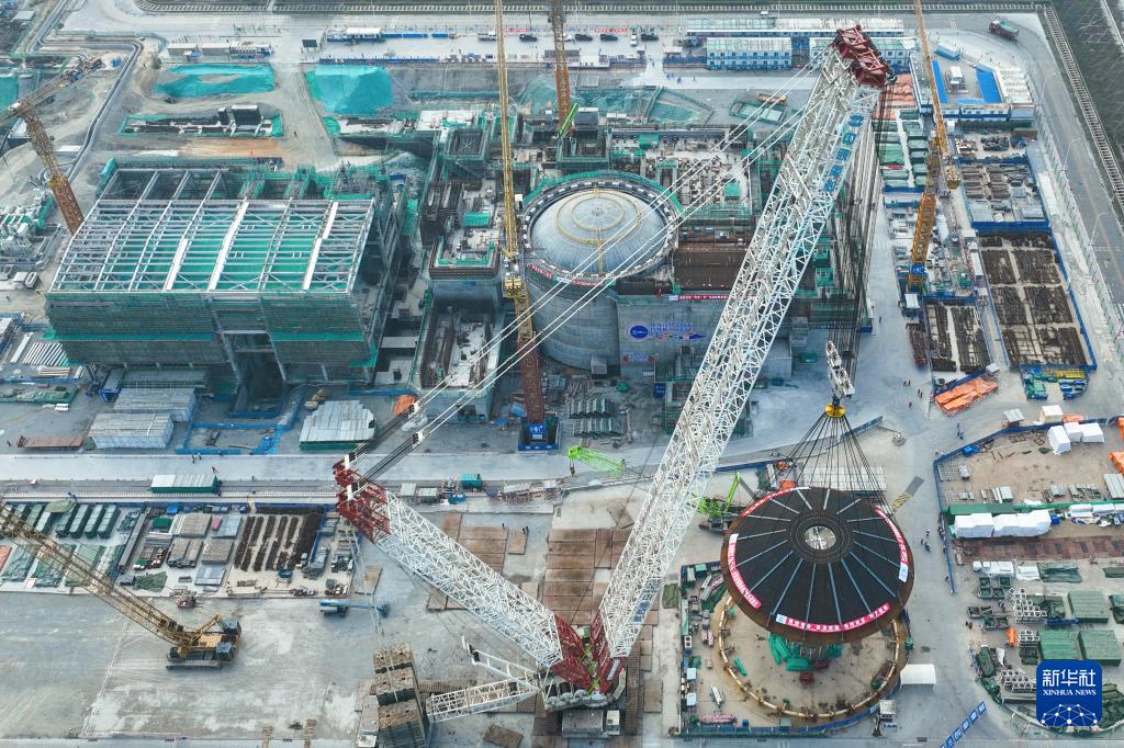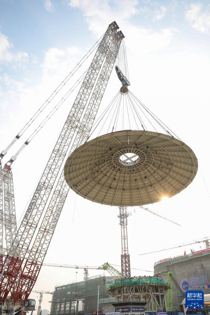 2月6日,海南昌江核電廠多用途模塊式小型堆科技示范工程“玲龍一號”外穹頂在進(jìn)行吊裝作業(yè)。