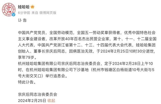 2月25日,娃哈哈官方微博發(fā)布其集團創(chuàng)始人、董事長宗慶后訃告,全文如下: