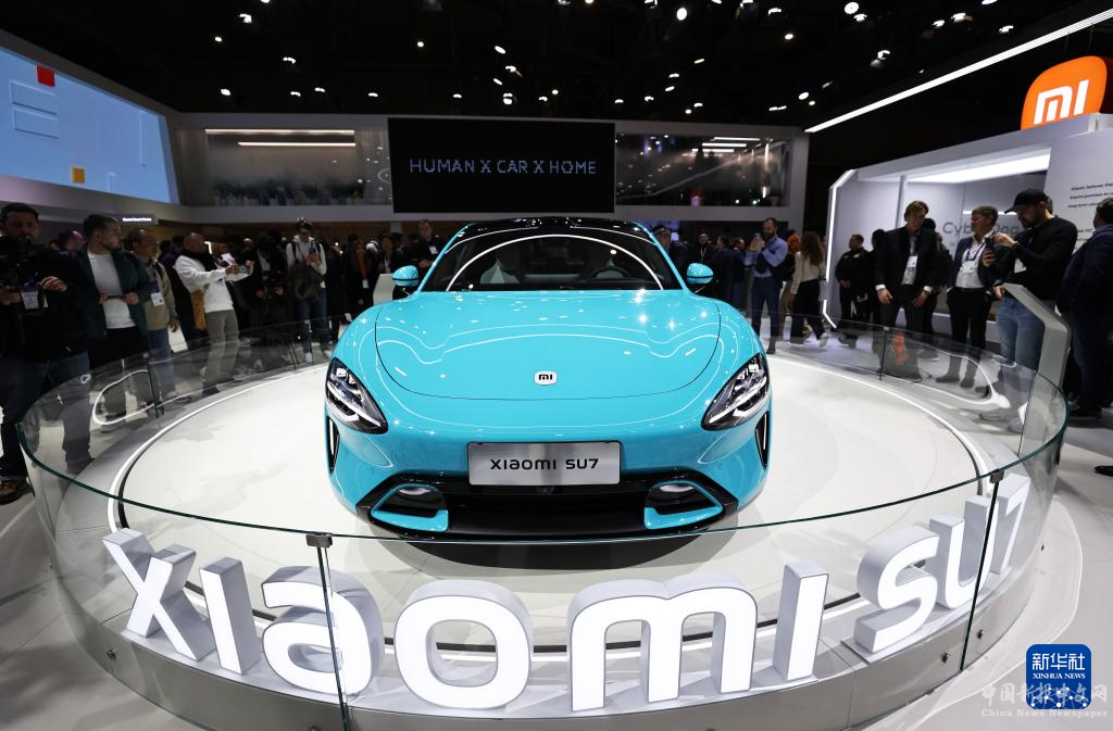 2月26日,在西班牙巴塞羅那舉行的2024年世界移動通信大會上,人們參觀小米SU7汽車。