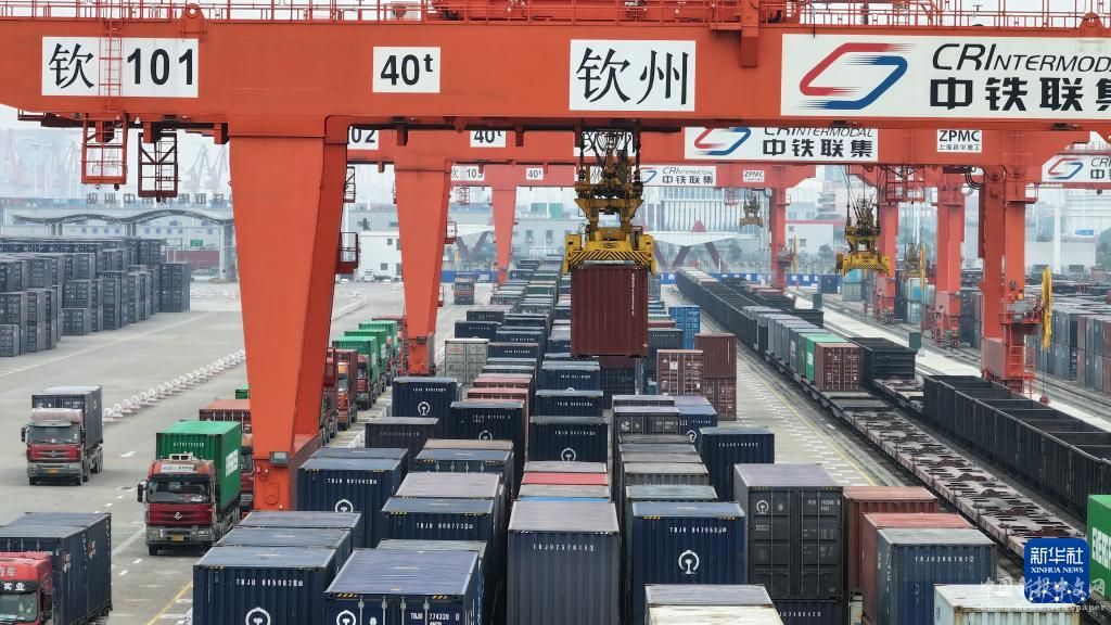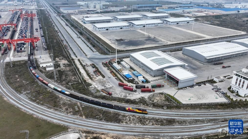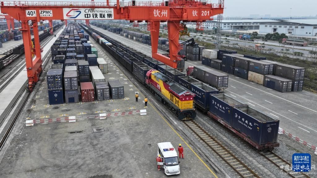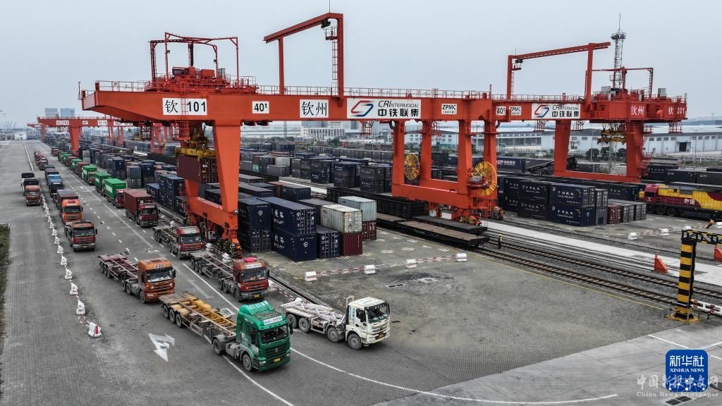 在廣西欽州鐵路集裝箱中心站,貨車在排隊(duì)裝運(yùn)集裝箱(3月1日攝,無(wú)人機(jī)照片)。