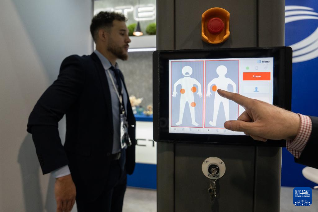 4月4日,在巴西圣保羅舉行的巴西防務(wù)展上,一名工作人員演示一款同方威視的安防裝備。