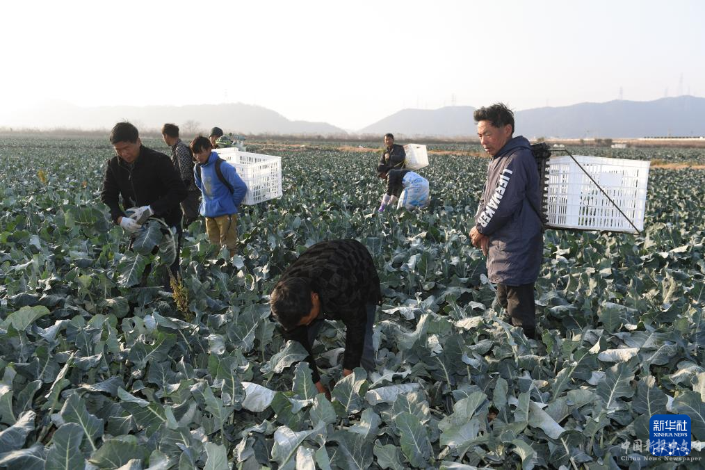 1月3日,在浙江省寧??h胡陳鄉(xiāng)海航家庭農(nóng)場(chǎng),來(lái)自四川涼山彝族自治州的務(wù)工人員在采收西蘭花。