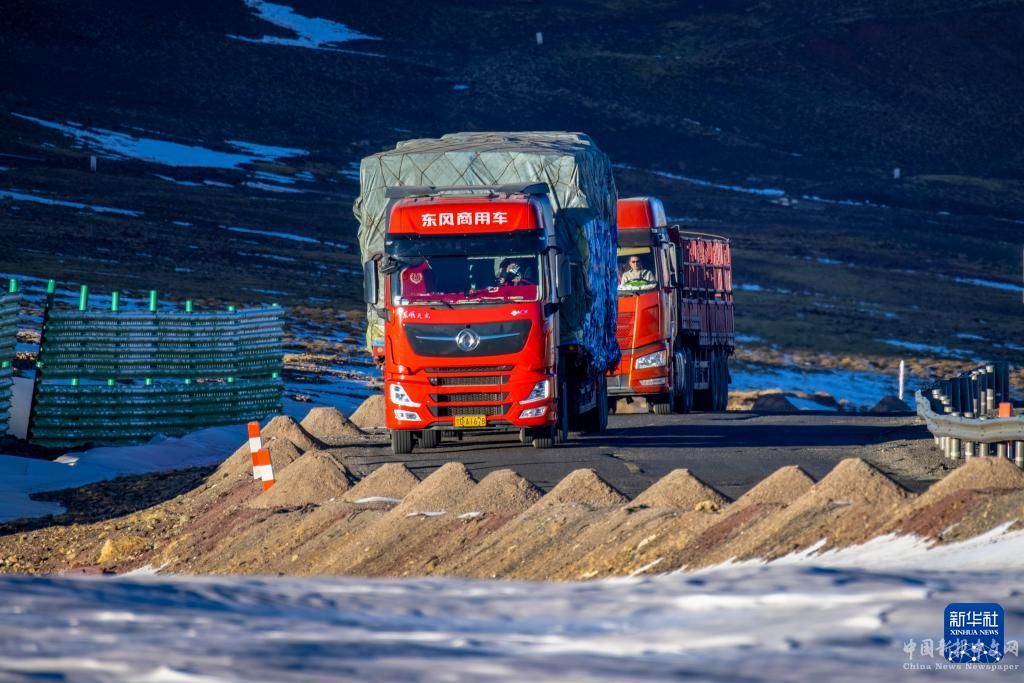 運(yùn)載著申扎縣供銷合作社為偏遠(yuǎn)鄉(xiāng)鎮(zhèn)果蔬配送試點項目從西寧采購的50噸新鮮果蔬的貨車經(jīng)過唐古拉山口(1月3日攝)。