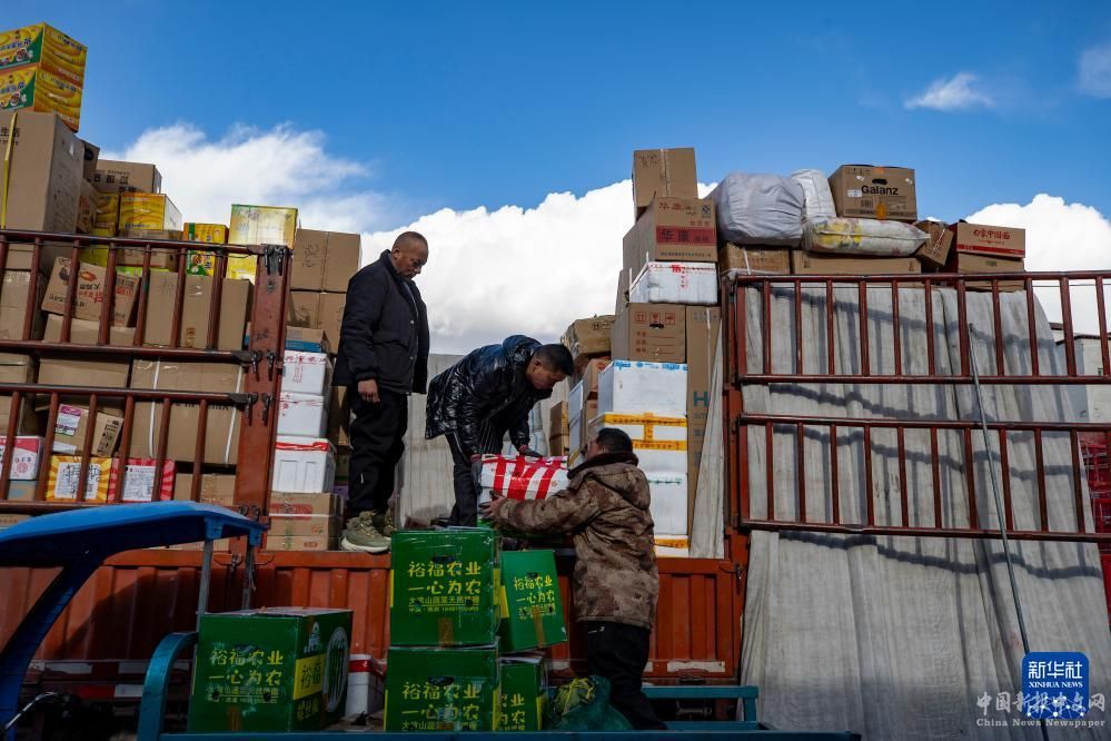 申扎縣供銷合作社員工在拉薩為偏遠(yuǎn)鄉(xiāng)鎮(zhèn)果蔬配送試點項目的貨車上貨(1月2日攝)。