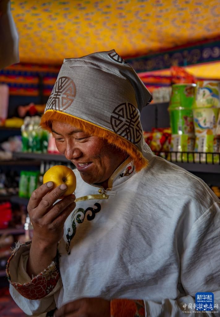 申扎縣馬躍鄉(xiāng)貝嘎四村偏遠(yuǎn)鄉(xiāng)鎮(zhèn)果蔬配送試點項目直銷點店主西熱加措拿起供銷合作社配送來的水果(1月5日攝)。